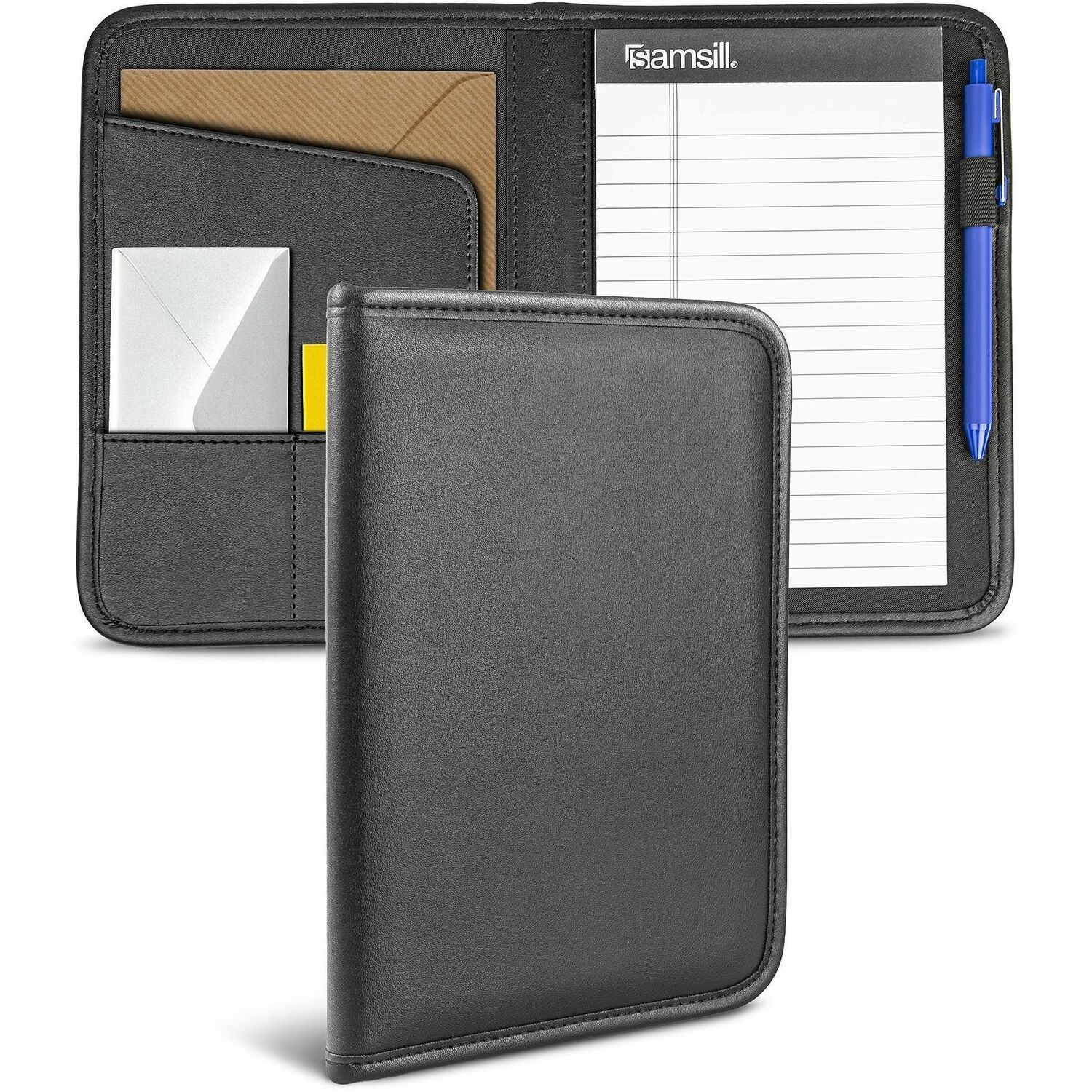 The Samsill Professional Padfolio helps make organizing your life at work more comfortable and stylish. It uses synthetic leather that carries the feel and look of premium Napa Leather to help make a positive and lasting first impression. The minimalist design is a perfect fit for all environments, from Fortune 500 boardrooms to classrooms. A document pocket lets you store anything and everything from loose pages, letters and envelopes to leaflets, invites and personal IDs. A standalone business card holder can hold all your business cards in one place. The refillable letter-sized writing pad measures 8.5" x 11" and is accompanied by a pen loop.